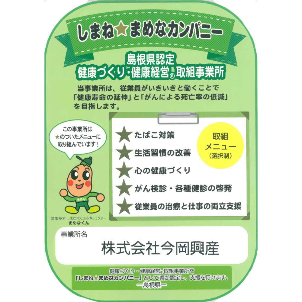 この度、健康づくり・健康経営取組事業所として『しまね☆まめなカンパニー』に認定されました。